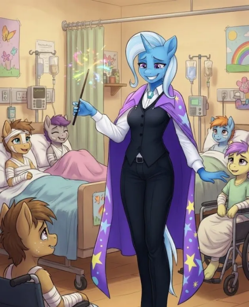 Trixie: "Her name's Brightflower Burst." She sniffled. "She wants to be.. a magician like me." She tilted her head. "Then there's Quartz Smoke. He wants to play soccer." She sniffled agian, trying to hold in the tears. "No one visits them, Dusk. No one." She slid against him, and held him. "Some of their families work two, three jobs to afford the care. Every now and then, one of them can stop in, if they have time." She let out a slow sigh.
