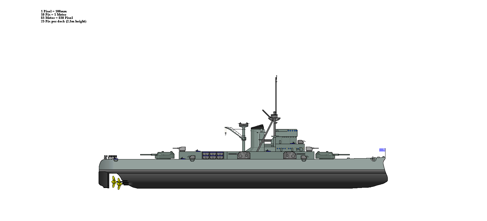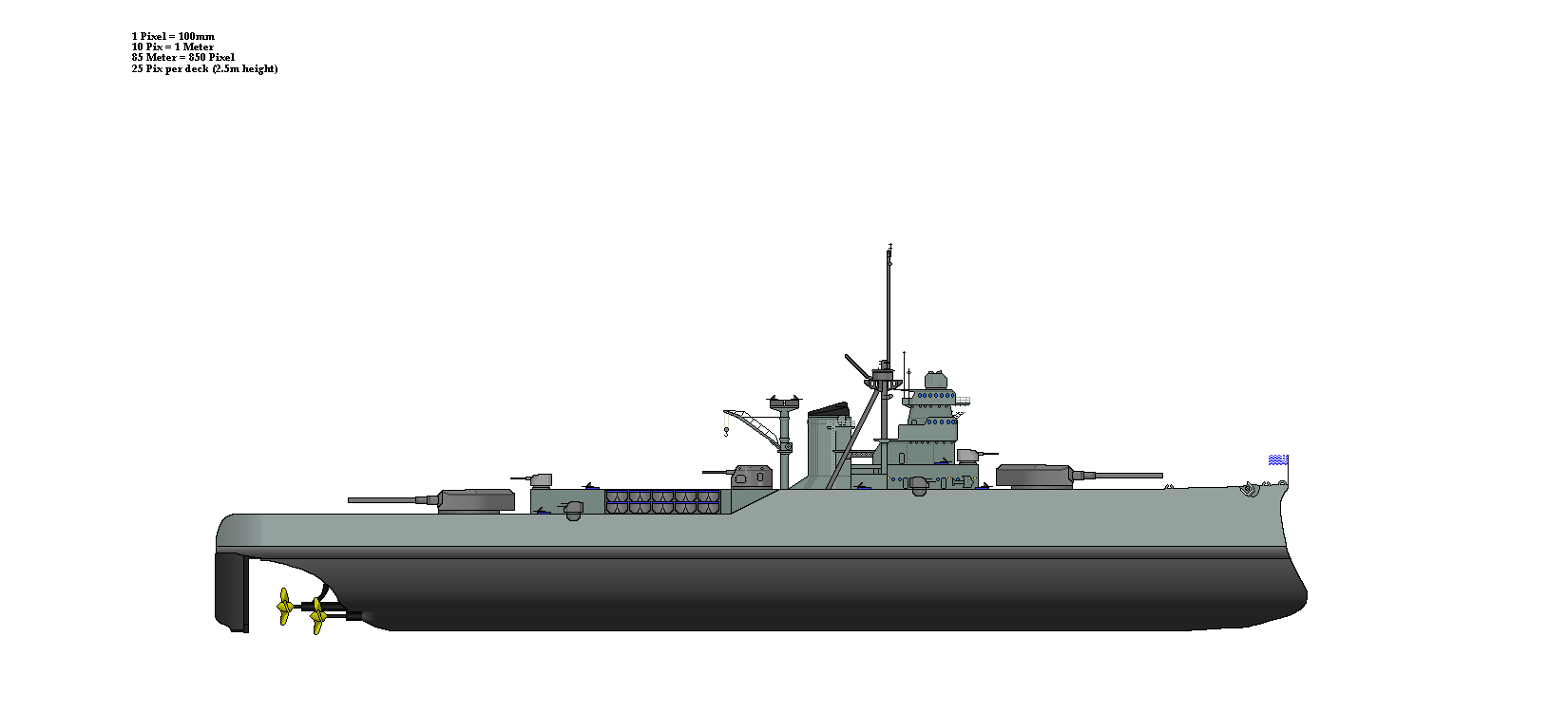 A serious upgrade to the AAA suite is accompanied by a massive upgrade to the main guns, so the ships can overmatch Tirek battleships. Scout planes give the ship some reach and eyes beyond the horizon. Given their superior floating ability, they have a longer loiter time in the field, and can be used for artillery spotting. Roaman 57mm AAA guns were purchased to suppliment the existing 25mm guns.